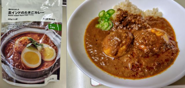 今回は「北インドのたまごカレー」を買いました。ゆで卵が2個入っています。肉不使用で以前から気になっていました。