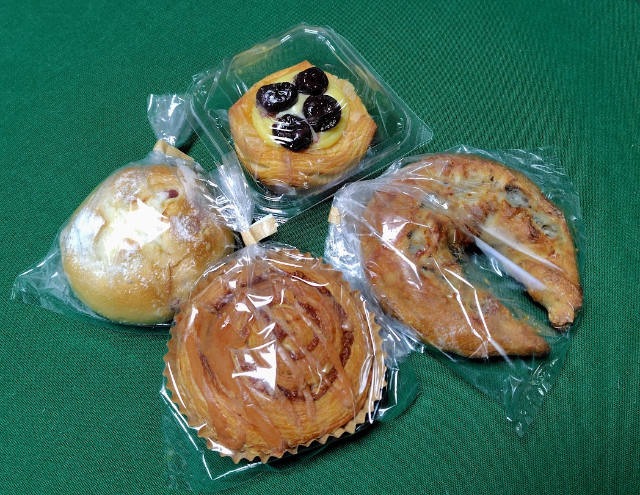一番上=ダークチェリー(¥380)、中左=クランベリーフロマージュ(¥260)、中右(三日月型)=ゴルゴンノア(¥390)、下=シナモンロール(¥280)。
