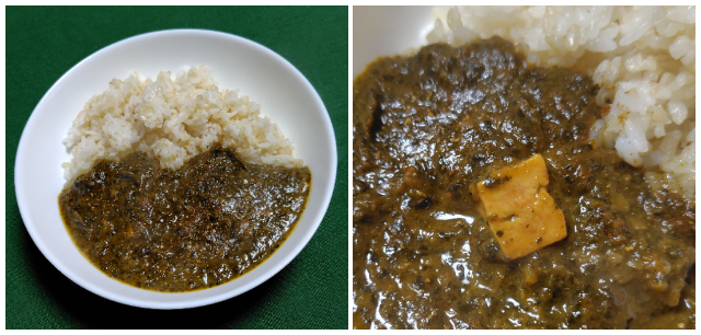 調べてみたら、作りたては鮮やかな緑色をしているらしいのですが、時間とともに変色して最後はこんな茶がかった色になるということでした。インド料理屋さんで食べるならきっともっと緑色なんでしょうね、今度機会があれば検証してみます。